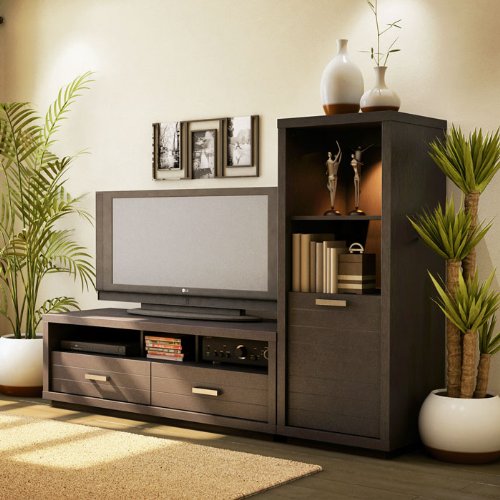 Skyline Chocolate collection TV stand with audio cabinet by South Shore Furniture is constructed of engineered wood products with a Dark Chocolate laminate finish.TV stand features two spacious drawers to keep DVD and CD collections organized, and the open storage space keeps electronic equipment accessible yet neatly tucked away. Sleek metal handles and grooves on the drawer fronts add to the stand's modern style.Audio cabinet features two adjustable shelves and builtin lighting. A second adjustable shelf behind the door helps you make the most of the enclosed storage space. Door front has decorative grooves and a sleek metal handle. Cabinet includes wall anchoring bracket for safety. Ships ready to assemble.